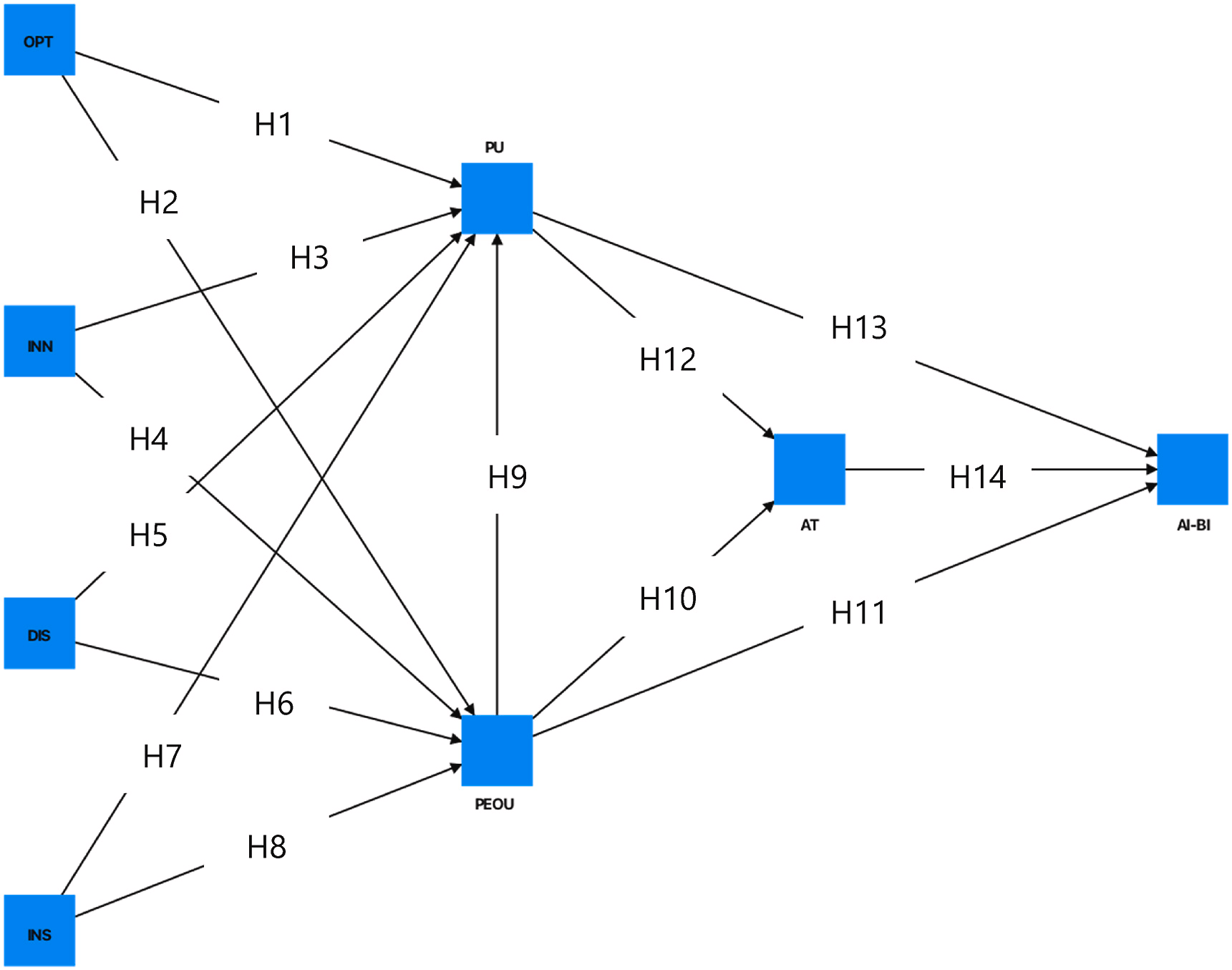 COMO FUNCIONA: O modelo mede quatro traços de prontidão tecnológica, otimismo (OPT), inovatividade (INN), desconforto (DIS) e insegurança (INS), e os conecta aos pilares clássicos do TAM: facilidade percebida de uso (PEOU), utilidade percebida (PU), atitude (AT) e intenção comportamental de usar IA (AI-BI). Com PLS-SEM (SmartPLS 4.0) e bootstrapping de 5.000 reamostragens, o estudo testou 14 hipóteses sobre como esses fatores se encadeiam (por exemplo, como INS e DIS afetam PEOU e PU, e como PEOU e PU influenciam AT e AI-BI), além de checagens de validade e confiabilidade das escalas (alfa de Cronbach, CR, AVE, HTMT e Fornell-Larcker).
